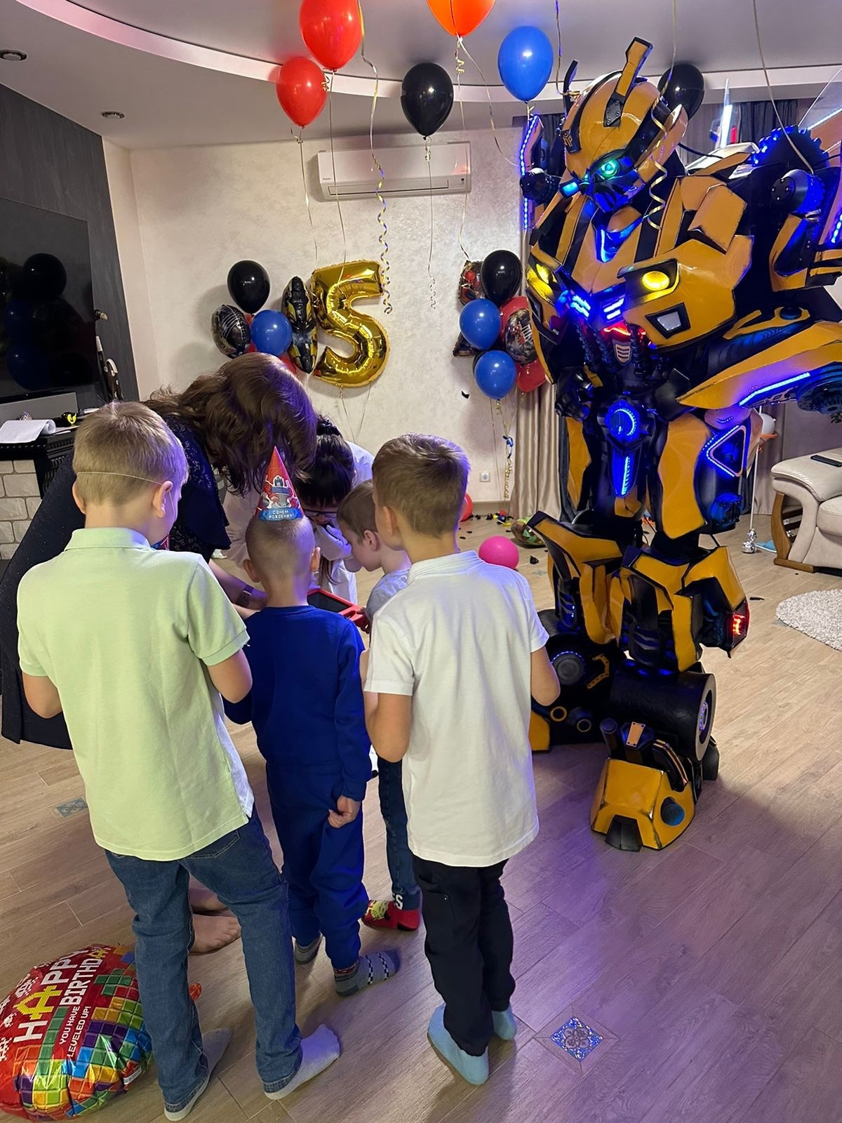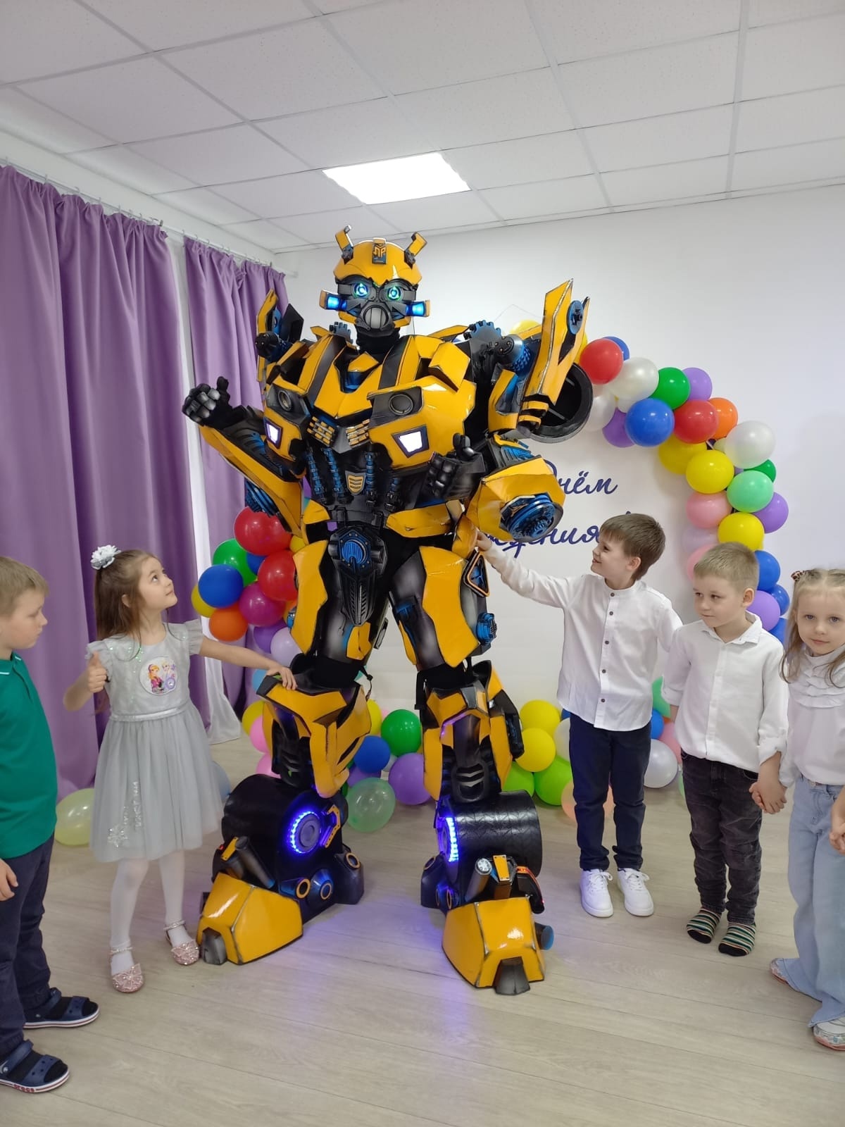 Наши костюмы оснащены: Встроенной музыкальной аппаратурой, Многофункциональными адресными диодами каждой детали костюма, Голосовой модулятор (аниматор говорит голосом робота, есть 2 режима), Автоматические звуки шагов и трансформации, Огромный светозвуковой бластер с настоящим лазером (прожигает бумагу, шары, пластик).